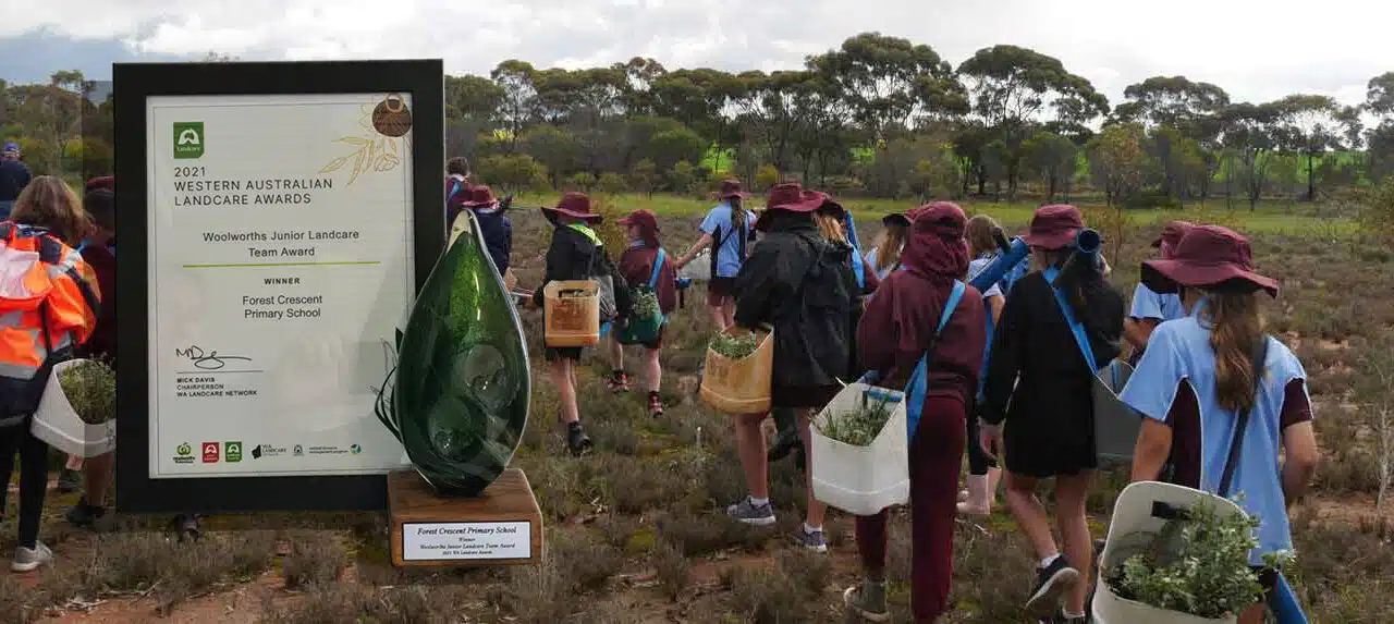 Winning the 2021 WA Woolworths Junior Landcare Team Award recognises Forest Crescent Primary School students from Year 4 to Year 6 who were not only involved in several tree planting projects throughout 2021 but also the efforts from previous years where our students tackled other tree planting projects. It is the recognition of students and staff who want to impact the environment positively. Their efforts promote healthier soils, reduce the effect of salinity, restore the land to its original ecosystem and the natural habitat for native wildlife, reduce greenhouse gases, and provide natural carbon sinks.