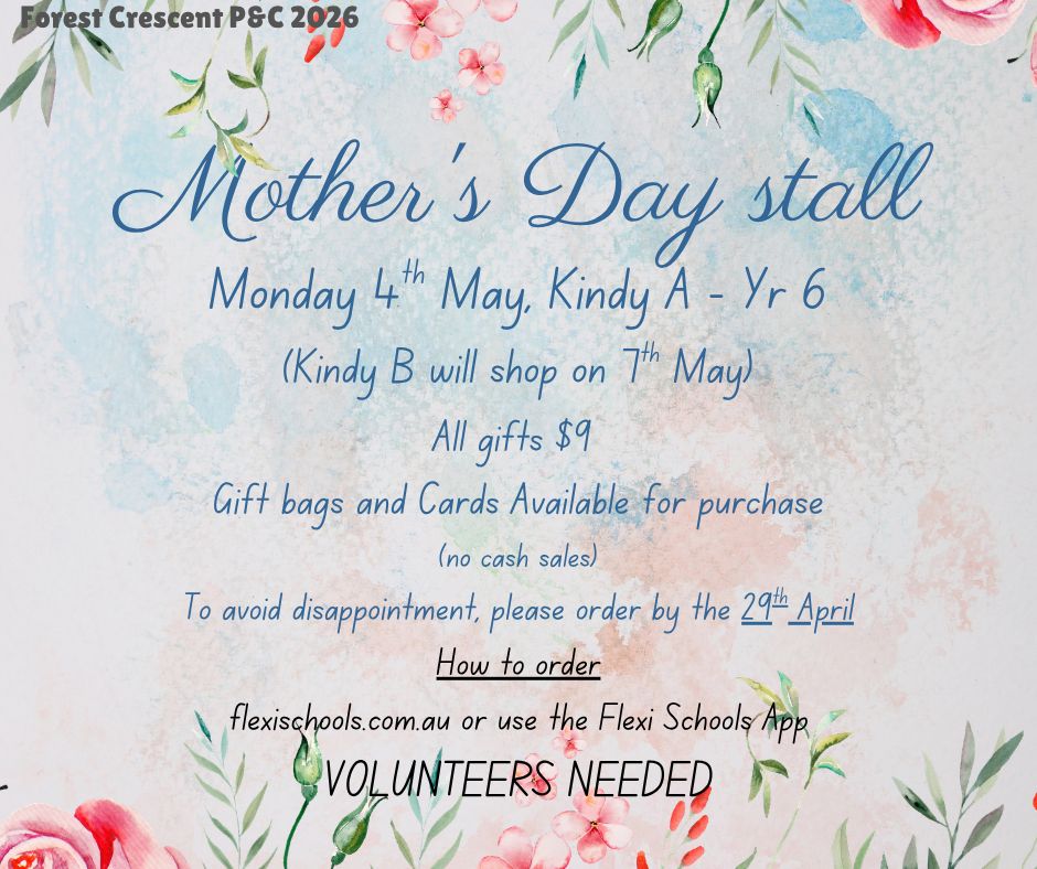 Forest Crescent P & C is holding our annual Mother’s Day Stall, where your child can pick a gift for their Mothers, Grandmothers, and other extraordinary women in their lives. Kindy B will have their stall on Thursday, 7th May.