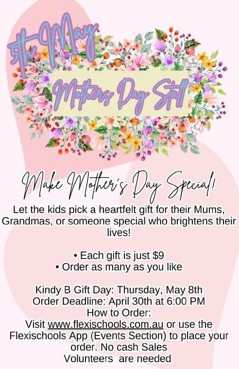 Forest Crescent P & C is holding our annual Mother’s Day Stall, where your child can pick a gift for their Mothers, Grandmothers, and other extraordinary women in their lives. All Kindy to Year 6 classes will participate in the stall held on 5th May. Kindy B will have their stall on the 8th May.