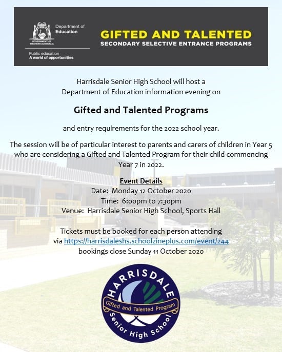 Department of Education Gifted and Talented Programs information evening that is being held at Harrisdale Senior High School on the evening of the first day of next term, Monday, 12 October. The session will provide parents and carers with information about the range of Gifted and Talented Programs delivered across public secondary schools in WA, and will also provide me with an opportunity to let families know about the academic program commencing at Harrisdale SHS next year.