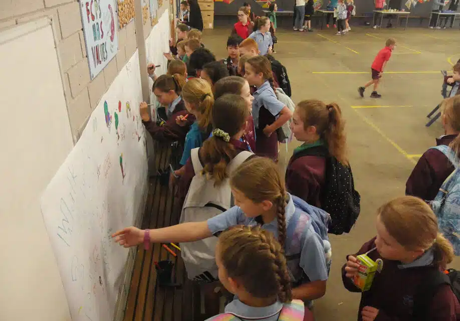 The students participated in a “Listening Walk”, which you can view in the video clip below. There was a large paper banner in the undercover area where participants could write or draw what they heard on their walk to school.